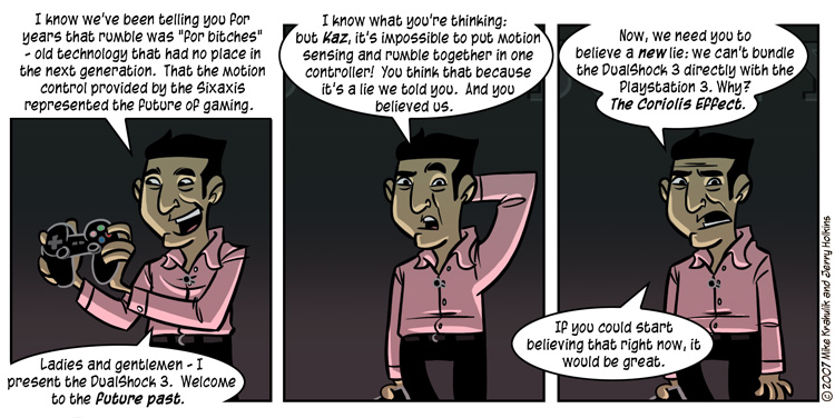 […] (Almost a year and a half after the PlayStation 3 arrived in stores, Sony fans will get the controller they wanted all along. The rumble-ready, motion-sensitive DualShock 3 ships next spring.) The worst-kept secret on the Web is out: Sony confirmed last night the rumble-ready, motion-sensitive DualShock 3 is bound for the PlayStation 3 in spring 2008.No price yet, but Sony tells me the controller will work with PlayStation and PlayStation 2 games played on the PS3—so long as the original PS and PS2 games support rumble.It’s a good move. I guess. Sort of. Well, not really. The controller won’t arrive for about another six months, and it raises some ugly questions for Sony: Will customers save their pennies and wait to buy a PS3 next spring rather than this Christmas? Will early PS3 adopters feel cheated? Can Sony afford to lose another six months to Nintendo and Microsoft? And what does the DualShock 3 say about Sony’s roadmap for the PS3? Let’s rewind to February, when Sony’s Phil Harrison dismissed rumble and told GameDaily: “I believe that the SixAxis controller offers game designers and developers far more opportunity for future innovation than rumble ever did. “Now, rumble I think was the last-generation feature; it’s not the next-generation feature. I think motion sensitivity is.”I hope Sony’s got another bombshell to drop before the sun sets on the 2007 Tokyo Game Show; somehow, I don’t think the DualShock 3 is strong enough to rumble with Halo 3.UPDATE: Sony is scrambling to include rumble in PS3 games currently on the market. You can find the complete list of rumble-ready PS3 titles on Sony’s Three Speech blog. Link to this | E-mail this | Digg this | Post to del.icio.us Published Thursday, September 20, 2007 9:29 AM by tylertodd Filed under: PlayStation 3, PS3, rumour […]